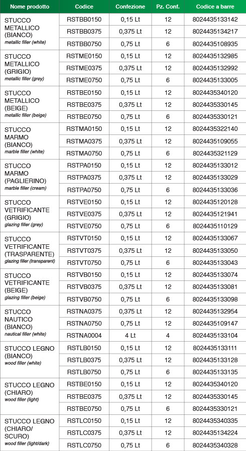 Stucchi professionali per carrozzerie, espressamente formulati per la ricostruzione di piccole parti. Possono essere ricoperti con altri stucchi o con qualsiasi tipo di prodotto di finitura.